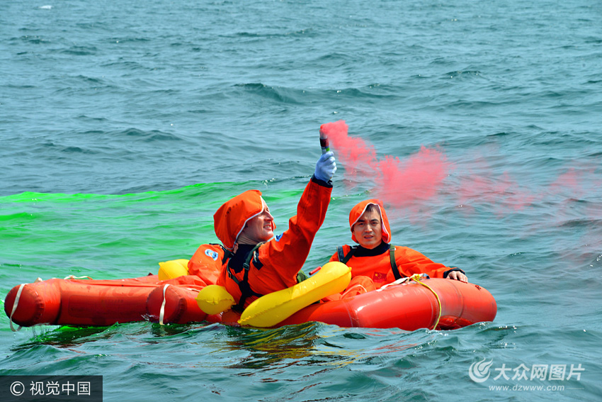 歐洲航天員馬蒂亞斯·約瑟夫在小艇上使用光煙信號管。