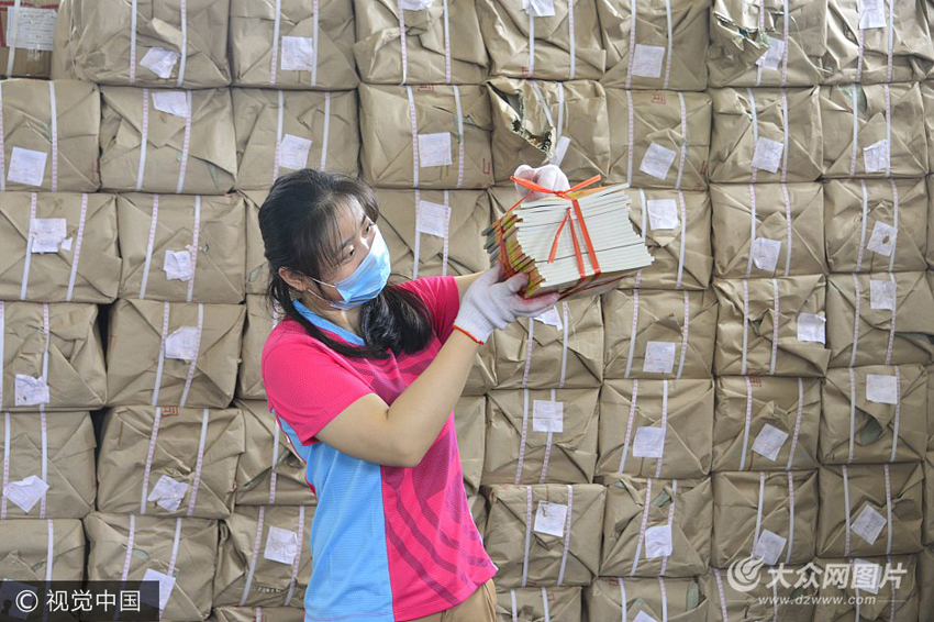 茌平縣新華書店教科書配送中心,工作人在分發(fā)新學(xué)期書籍以備開學(xué)使用。