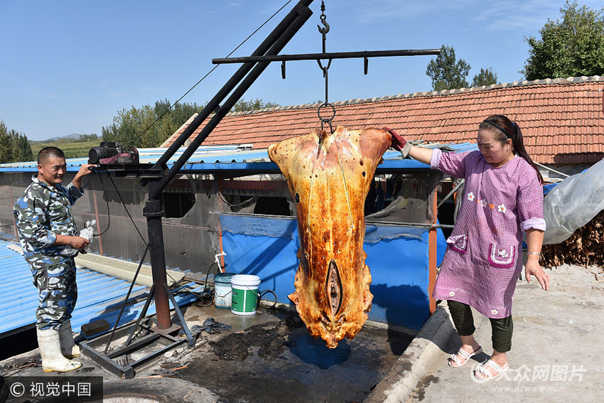 9月20日,日照市東港區三莊鎮茂山村,楊善星(左)和妻子王春英(右)正在查看一頭全豬的烘烤火候。楊善星在創業的過程中,把“夫妻烤全豬”做為品牌,在朋友圈中推廣,利用網絡的有效傳播,很快打出了名堂,西安、河南、青島等全國各地的網友和吃貨們,自駕千里找到他,想要學手藝。