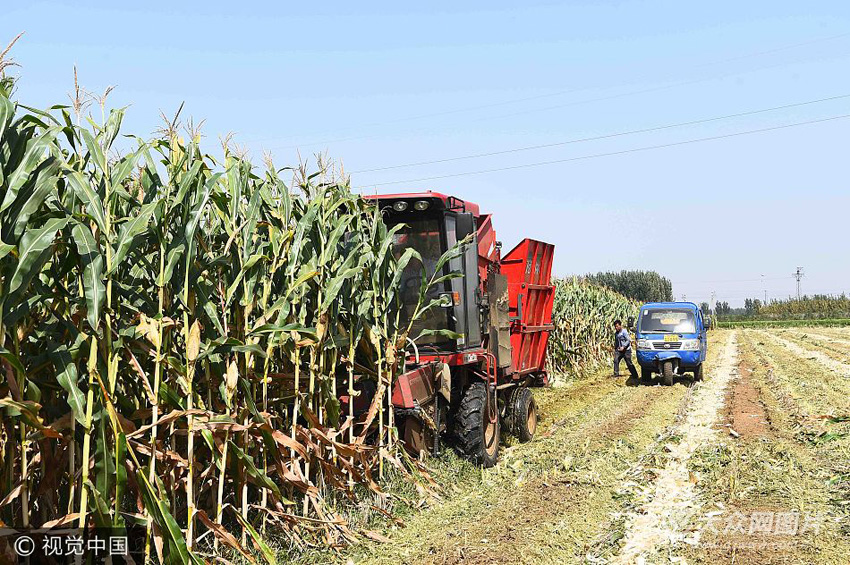 一臺收割機在濰坊青州市黃樓街道大貫店村農田里收獲玉米。