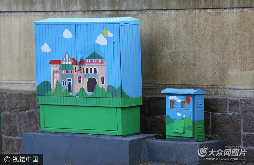 國慶長假期間,青島相關部門為八大關景區許多變電箱穿上“彩衣”,成為一道靚麗的風景線。這些變電箱均是美術人員手繪,主題為青島天主教堂、公主樓等著名建筑,配以藍天白云、園林綠植、山水田園風光,并配上環保、交通安全、講文明樹新風等標語,使原來單調的變電箱和海濱風景融為一體,變得藝術感十足,扮靚八大關陶醉游人。