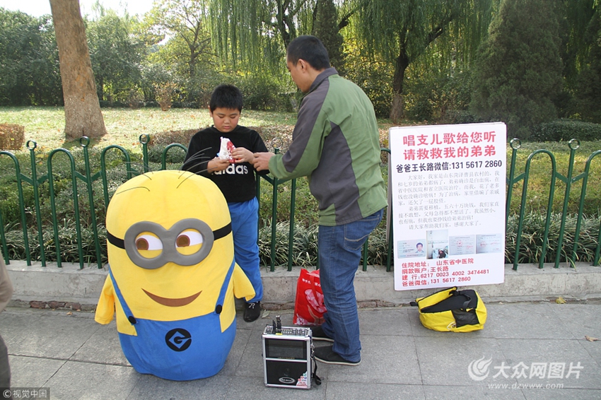 2017年10月31日,濟南趵突泉公園北門附近,半人高的“小黃人”玩偶里傳出孩子稚氣的歌聲,唱歌的是4個月前在山東省立醫院旁邊賣山藥救弟弟的9歲男孩新新(化名)。