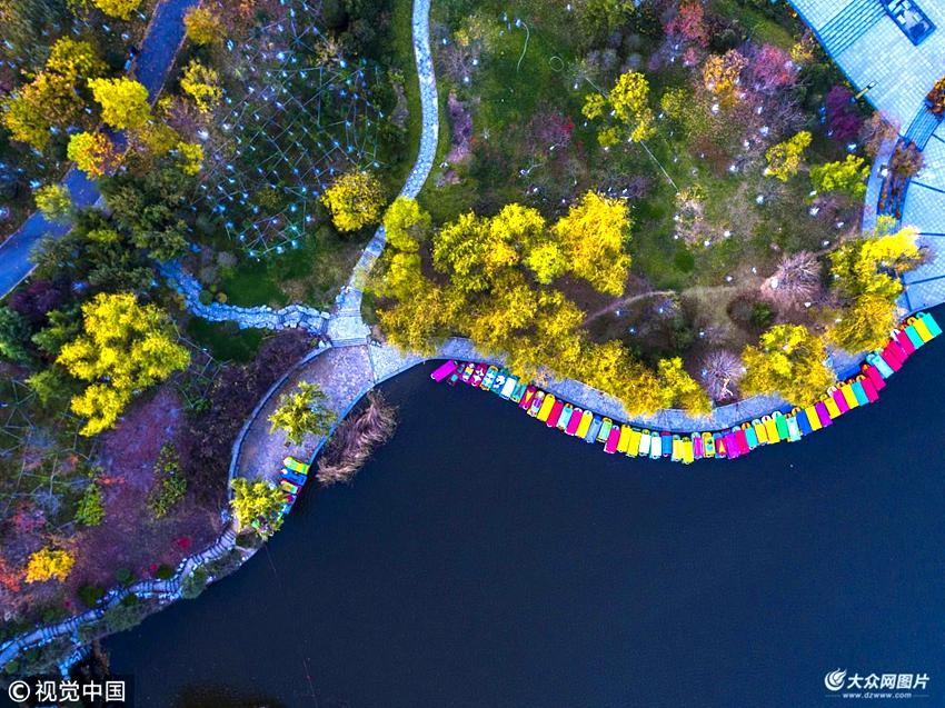 2017年11月10日,航拍初冬的濟南東部彩虹湖公園,遍地金黃,景色怡人,樹木、游船與湖波交相輝映、五彩斑斕,美如畫作。