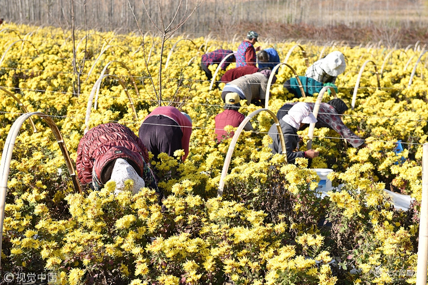 2017年11月11日,山東省日照市五蓮縣戶部鄉(xiāng)時家溝村,一名大媽正在采摘菊花。