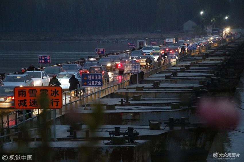 11月16日,濱州,傍晚高峰期,車輛首尾相接的通過黃河浮橋。
