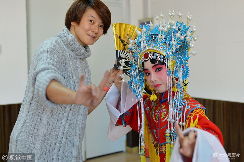 2017年11月27日,青島市京劇團的專業老師為表演的學生進行藝術指導。