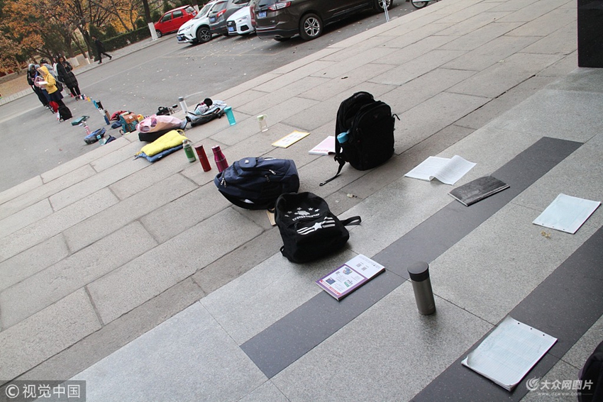 2017年11月29日清晨,在濟(jì)南一高校校園內(nèi)圖書(shū)館外頭,備戰(zhàn)考研的大學(xué)生用用水杯、書(shū)包、書(shū)本等神器排成一條百米長(zhǎng)龍,場(chǎng)面十分壯觀。