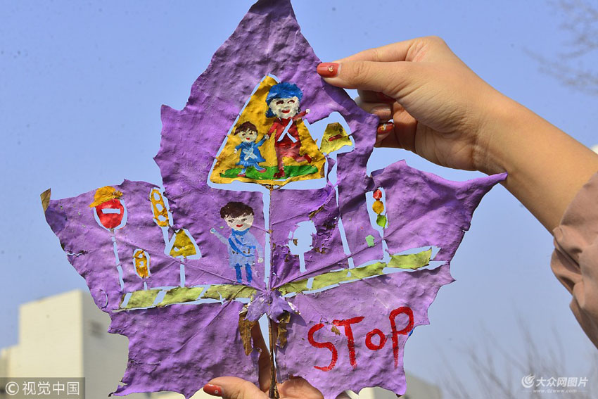 當日是“全國交通安全日”,為進一步學習交通安全知識,增強文明出行意識。山東聊城大學美術學院的大學生們舉辦了以“重視交通 刻畫安全”為主題的交通安全宣傳實踐活動。大學生們大膽創新,結合自己的專業優勢,以雕刻、繪畫葉子的形式,展現了不要超速、走斑馬線、注意安全、小心追尾等交通安全的部分標示、標志。積極營造交通安全宣傳的社會氛圍。