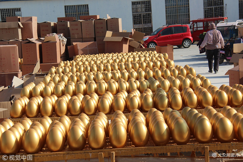 12月5日,臨沂,一走進臨沂市費縣水湖村就看到路邊擺滿了各式各樣的“金蛋”,這就是全國著名的中國水湖“金蛋”電商基地。這個村里有好多人以前做石膏手藝的。農(nóng)閑時蹲街串巷的制作銷售,趕上好的時候也能養(yǎng)家糊口。這一切銷售模式的改變還得從2000年以后說起。自從李永主持的央視《非常6+1》的‘砸金蛋’節(jié)目開始。全國各地的“金蛋”生意就火爆了起來。水湖村大部分百姓都開始加入到這個行業(yè)中來。全村七百多戶,參與加工制作的達到了六百多。幾乎是全民皆兵。