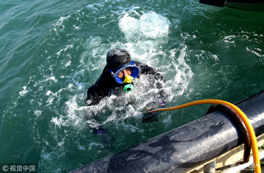每年“小雪”過后,位于北緯36°的青島就到了捕撈野生海參的時節。2017年12月4日,攝影師穿上潛水服,與撈參人一起下到海底,拍攝撈參人的海底海參捕撈生活。
