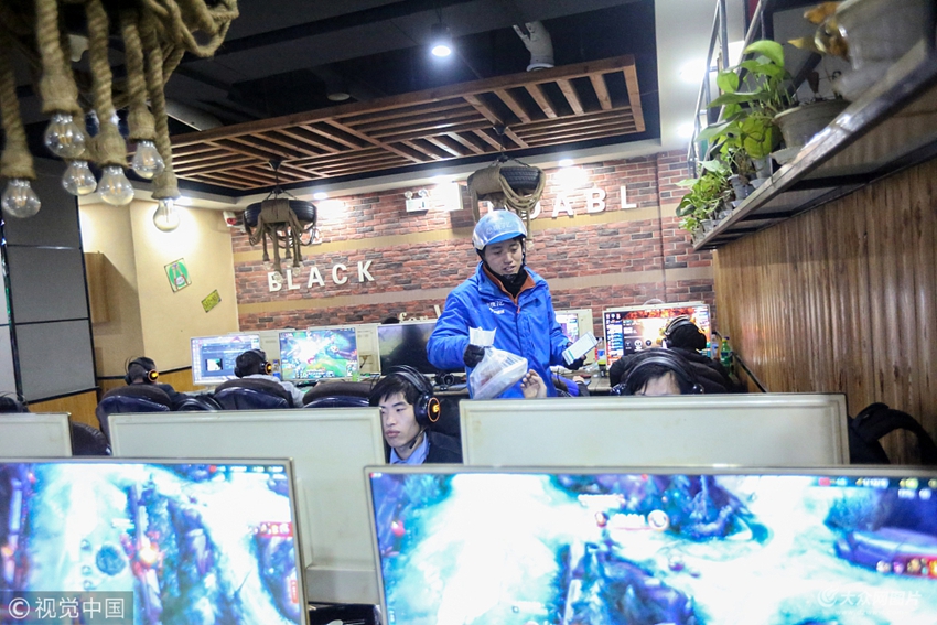2018年1月1日,濟南,窯頭路上的一家網吧,一位玩家頭也不回地接過韓化龍手中的外賣。