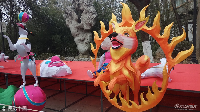 2018年1月17日,在山東濟(jì)南趵突泉景區(qū)內(nèi),各式各樣狗的造型成為第三十九屆趵突泉迎春花燈的主角。