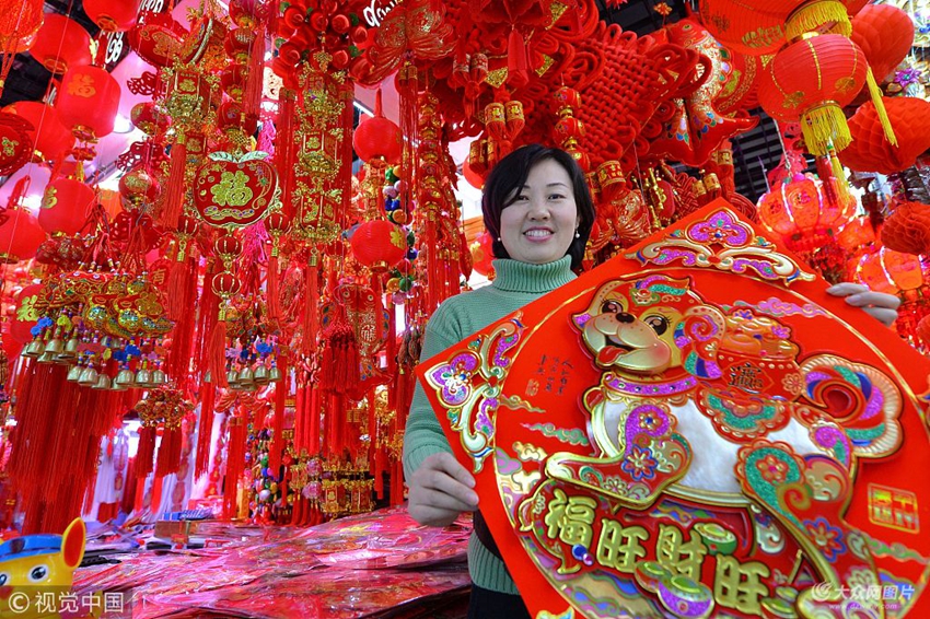 2018年1月21日,青島年貨市場陸續升溫,“年味”紅遍飾品市場。圖為一名業主展示狗年生肖吉祥門帖。