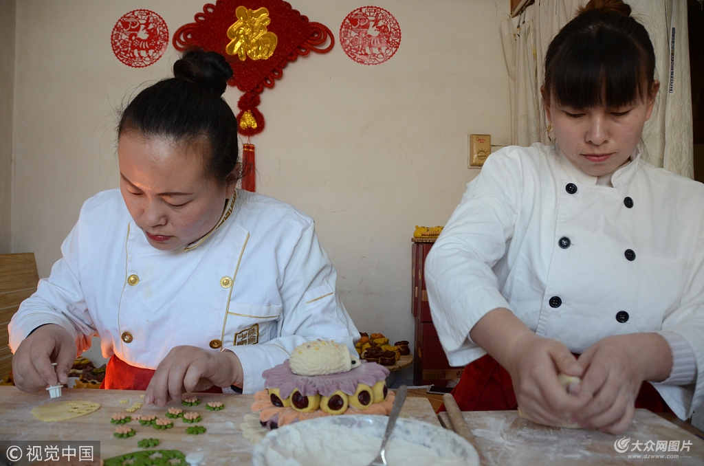 2018年1月29日,山東省聊城市東昌府區(qū)居民高玉(左)和妹妹高芳(右)正在制作花糕。