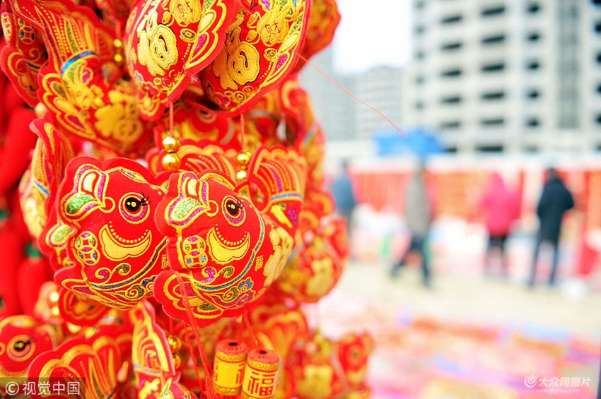2018年1月30日,山東青島西海岸新區一農村大集,市民在購買福字和春聯。