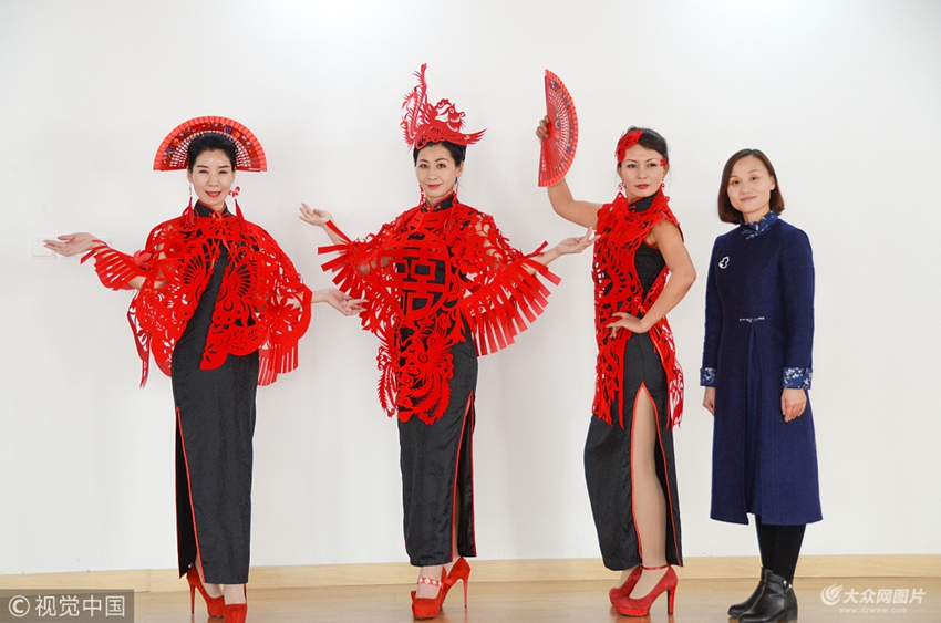 2018年2月4日,山東聊城。旗袍愛好者展示梁穎設(shè)計(jì)的剪紙服飾。