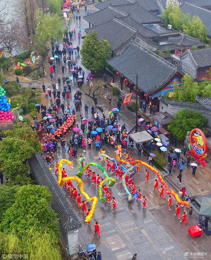 2018年03月18日,山東棗莊,在臺兒莊古城開河祈福大典上,民間舞龍隊正在表演“龍?zhí)ь^”。