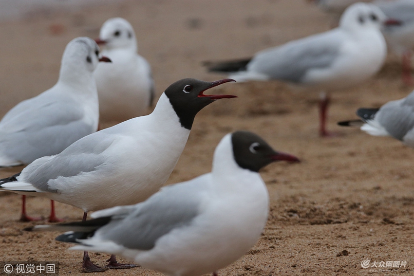 2018年3月20日,人們在山東省青島棧橋景區(qū)賞海鷗。