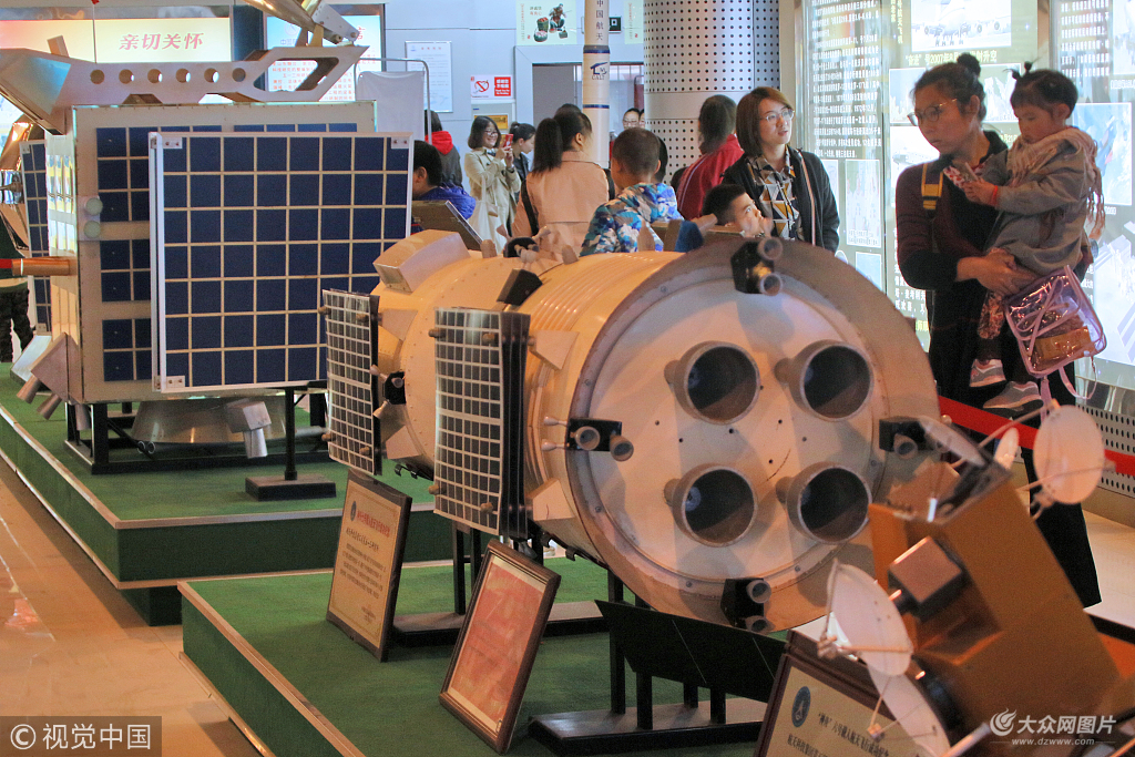 2018年4月22日,山東煙臺,市民在中國航天513所觀看航天裝備模型。圖片作者:唐克/視覺中國