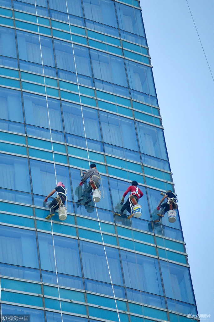 2018年5月7日,山東煙臺,在皇冠假日酒店,幾名“蜘蛛人”正在高空清潔建筑玻璃幕墻。圖片作者:唐克/視覺中國