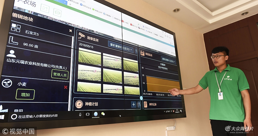 2018年5月15日,山東鄒平縣元瑞農業科技公司工人查看元瑞智慧農田監測系統終端數據,界面顯示的是公司農田管理園石寶文管理的農田環境情況。該系統可以監測公司農場的農作物生長溫濕度、氣壓、光照等十多項數據,用于指導田間生產。