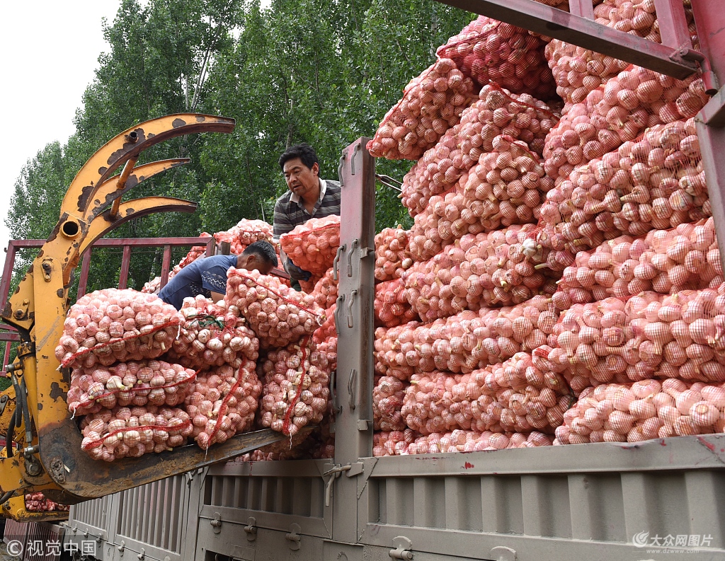 2018年5月21日,山東沂南縣一家腌漬廠工人在搬運(yùn)大蒜。