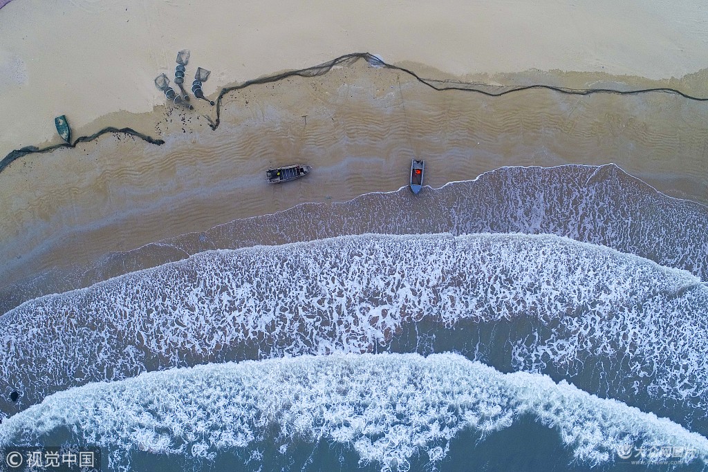 2018年11月21日,青島西海岸新區西環島路依偎的海濱海浪翻卷,海浪急切地涌上沙灘親吻大地,猶如一卷風景畫,親切而真實。
