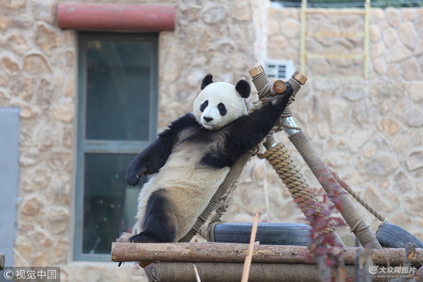 在濟南動物園熊貓館內(nèi),大熊貓懶洋洋的走出寢室,在游玩區(qū)擺出各種pose向市民展示它那漂亮身姿。