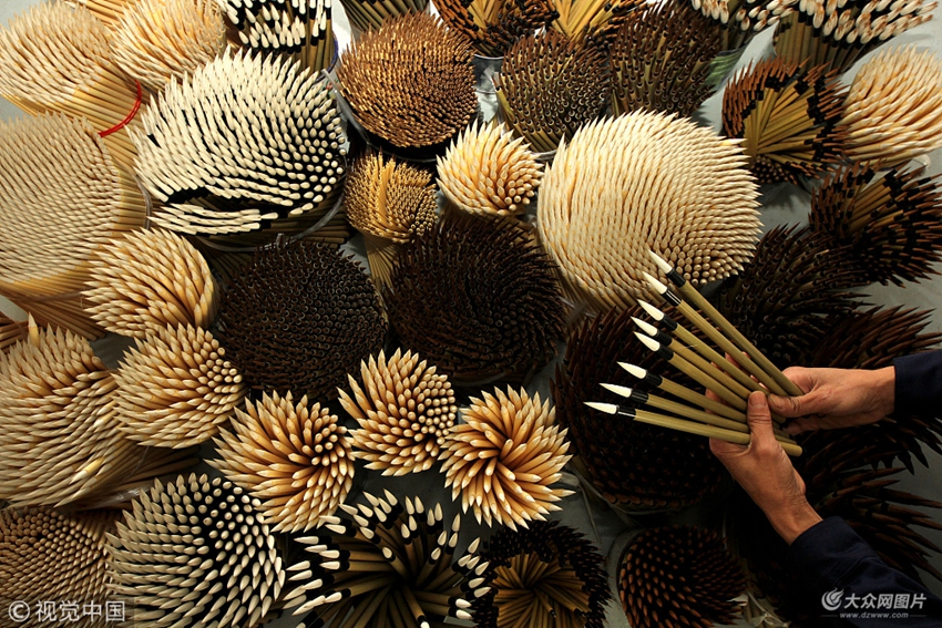 2018年11月25日,在山東省棗莊市陰平鎮,技術人員在檢查毛筆質量。