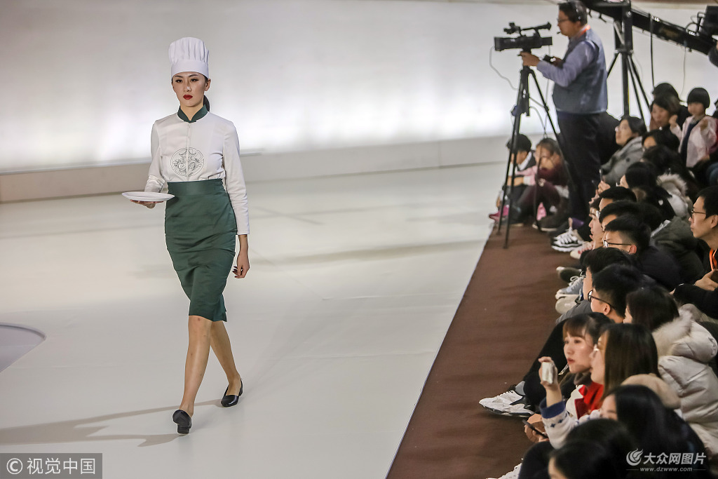 2018年12月3日,濟南,一場集生活與藝術、時尚與應用于一體的服飾妝扮展演亮相山東美術館,由此拉開了“為人民而設計”——山東工藝美術學院藝術與設計作品展的帷幕。模特們裝扮成“大廚”、“服務員”、“禮儀”等角色穿梭在T臺上,展示出大學生對功能性服裝的設計創意。