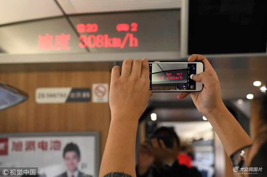 2018年12月17日,濟南,記者在濟青高鐵上用手機拍攝高鐵時速