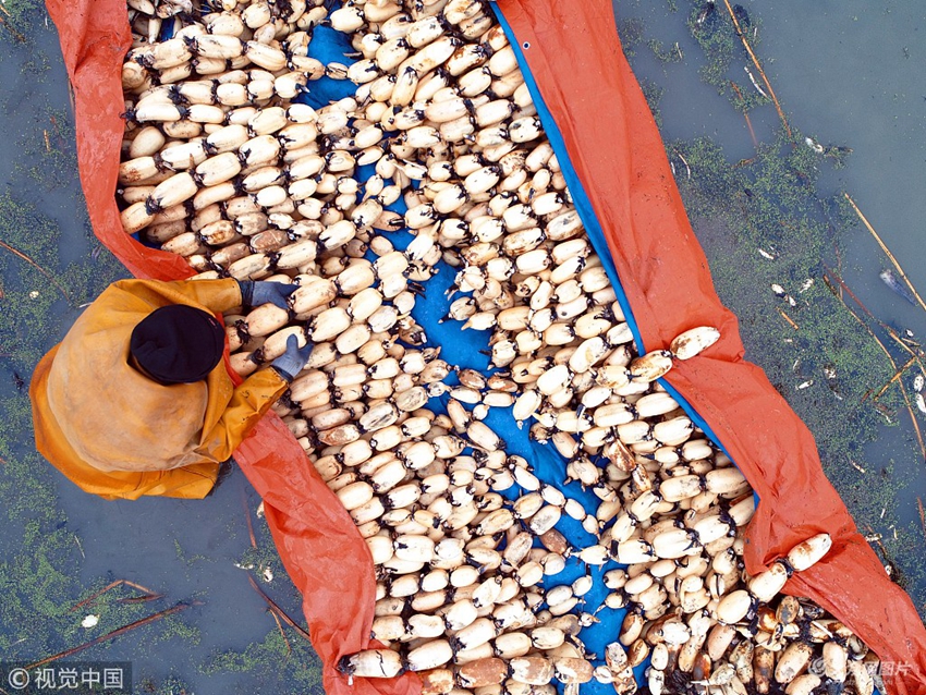 2019年1月5日,采藕工在山東省臨沂市郯城縣馬頭鎮(zhèn)的蓮藕種植基地破冰采收“雪蓮藕”(無人機(jī)拍攝)。