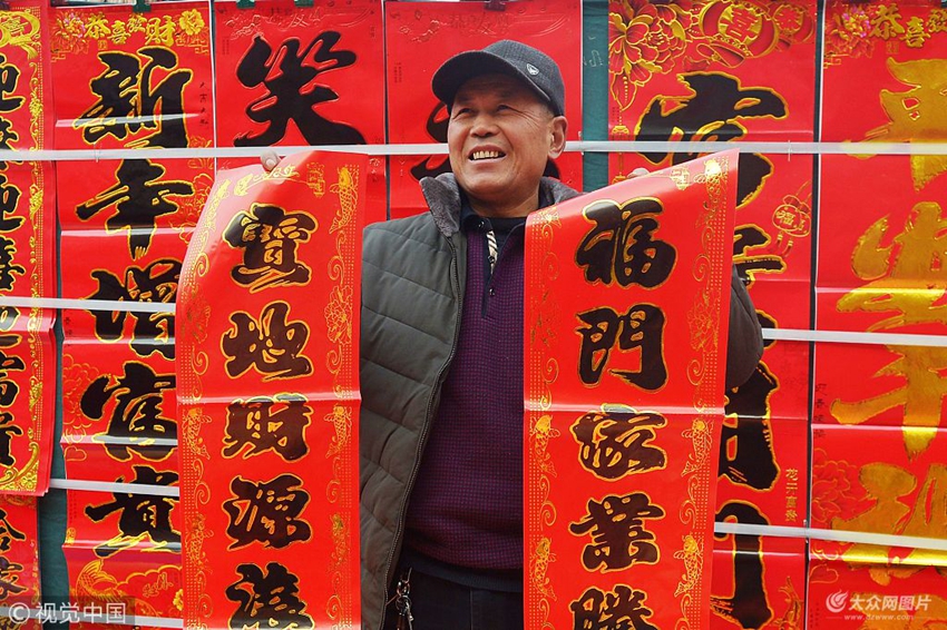 2019年1月7日,一名攤主在青島市李村年貨大集上向顧客展示對聯。