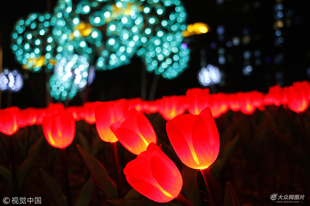2019年1月17日,山東威海榮成市區(qū)綠化帶內(nèi),由上萬朵LED燈組成的郁金香“花海”造型美輪美奐,足可以以假亂真,美麗的郁金香將濱城夜色裝點得更加靚麗,增加了濃濃的年味。