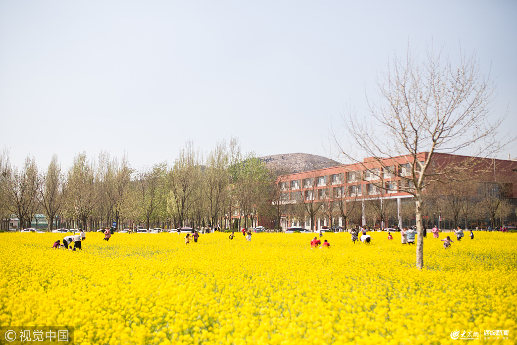 2019年3月31日,濟南,長清區(qū)的一所高校內(nèi),大片油菜花盛開,金黃色的花朵連成片蔚為壯觀。正值周末,大量市民涌入學校欣賞春景,倘若徜徉在花海之中。