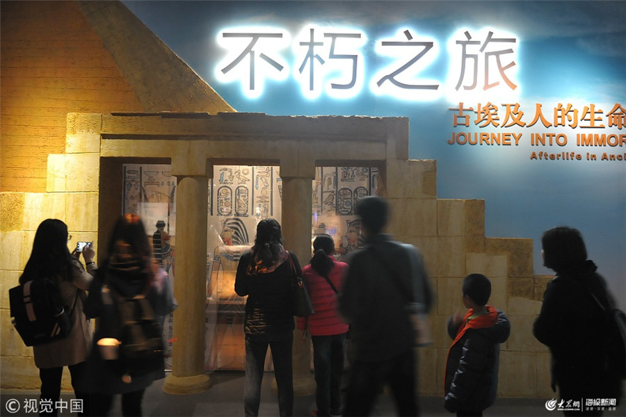 2019年3月31日,山東省濟南市,山東博物館“不朽之旅——古埃及人的生命觀”展覽第一天。展覽圍繞古埃及人永生的生死觀念,精心遴選來自意大利佛羅倫薩國立考古博物館的100件(套)古埃及珍貴文物,通過于莎草紙、石棺、雕像等多種載體之上的圖案、象形文字以及豐富多樣的隨葬品的解讀,輔以古埃及人的神話傳說、文化符號等,揭開古埃及人永生生命觀念的神秘面紗,進而窺探古埃及人的社會生活及其精神信仰世界!