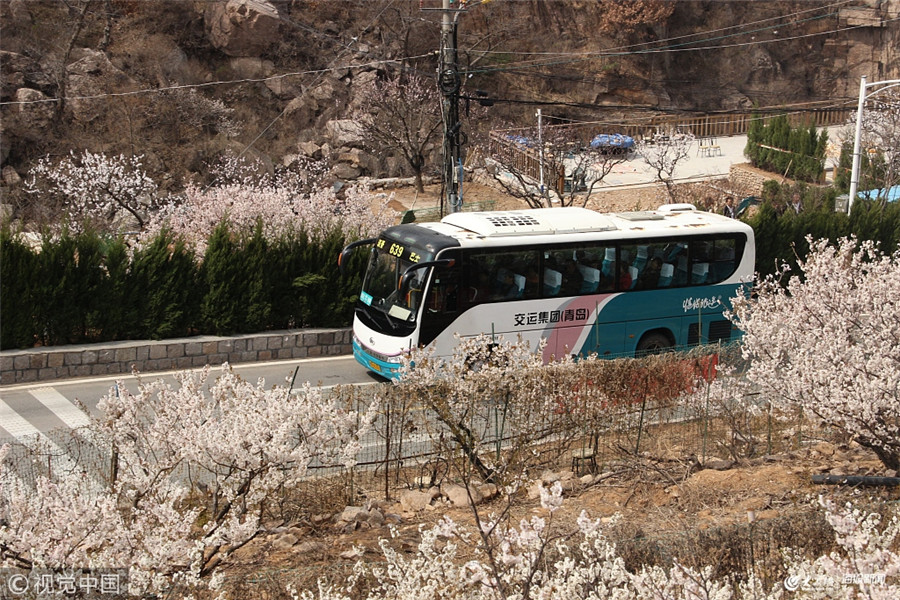 每到3月底4月初,嶗山都會有一趟開往春天的巴士,這條交運溫馨巴士639路公交線路穿行在漫山遍野的花海中,成為名副其實的“開往春天的巴士”。交運溫馨巴士639路公交線路是唯一一條進入嶗山北九水景區的公交車線路,從周哥莊發往觀嶗停車場,沿途經過16個站點,站站有景點,是一條名副其實的旅游公交線路。從周哥莊始發站開始,現在沿途櫻桃花盛開;不過有的山坡朝陽,除了花開以外,已經長出不少綠色的嫩葉,點綴在花海中顯得格外好看;山坡還有不少杏花和桃花也已經開放,粉紅色的桃花點綴在其中也非常好看。 從臥龍公交站開始正式進入景區,路的兩旁的山坡上數千株櫻桃開著粉白色的花扮靚山谷兩邊。市民游客如果從小路爬到周邊的山坡上往下看,那櫻桃花海美得令人流連忘返。