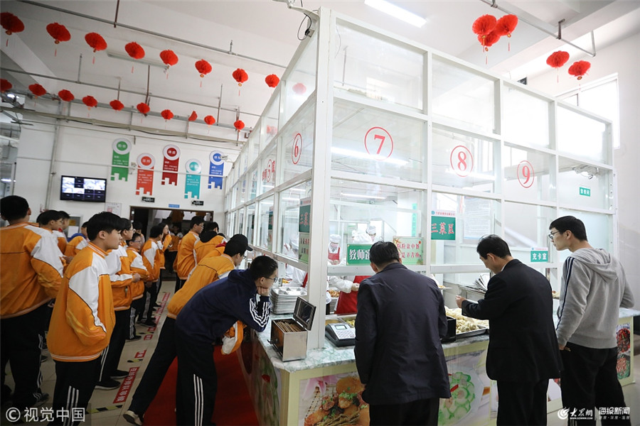 4月3日中午,山東日照市金海岸中學食堂內,校長董玉磊和學生們坐在一起,面前餐盤中的食物也和學生們的相同。董校長稱,校長陪餐制在日照市金海岸中學已經開展了一段時間,現如今已成為常態。