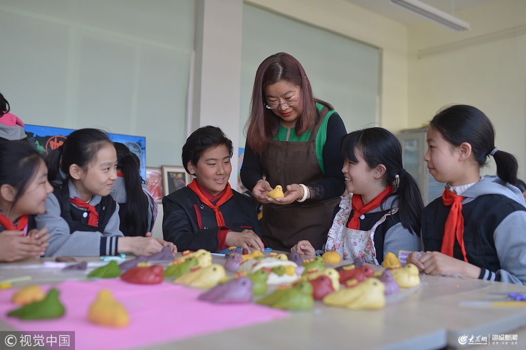 2019年4月4日,青島,四方實驗小學的孩子們體驗學做非遺花餑餑“小燕子”,在老師的指導下,通過捏、剪、壓花等手法,傳承膠東半島清明節傳統習俗,感受傳統民俗文化的魅力。膠東半島清明時節制作花餑餑的歷史悠久,每至清明,家家戶戶要制作“小燕子”面食迎接春播時節。