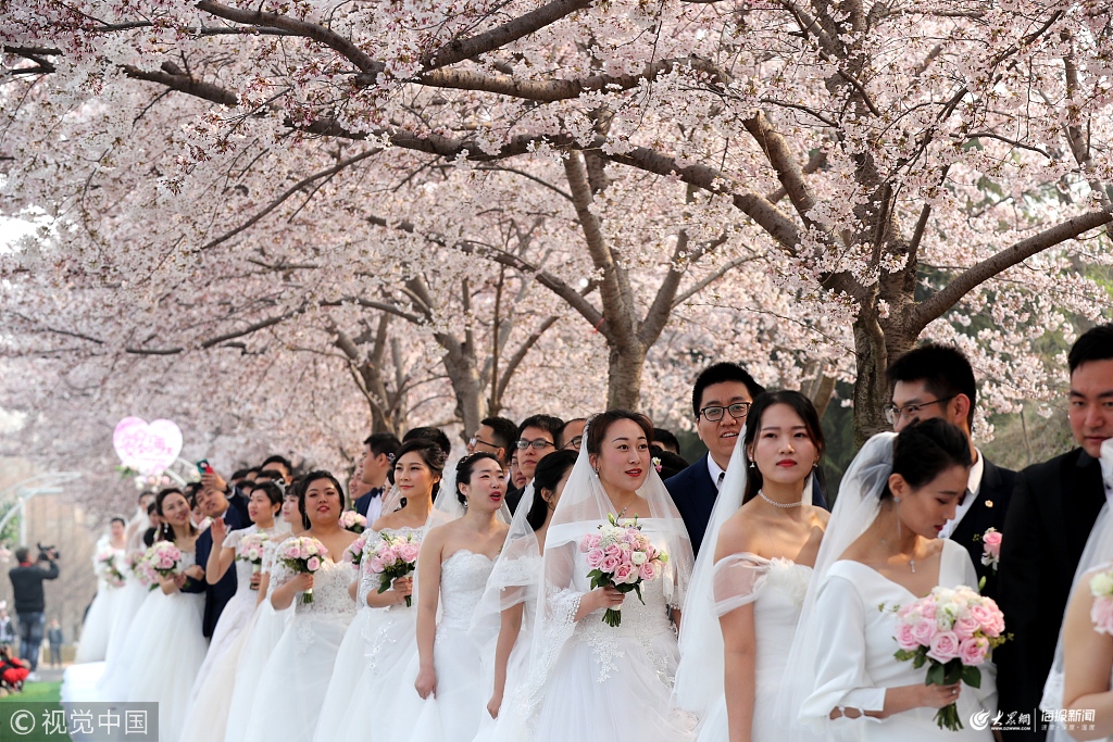 2019年4月6日,山東青島,中國海洋大學嶗山校區舉行“情如海大”校友集體浪漫婚禮,由132位校友結成的66對新人一一走過櫻花大道,在櫻花樹下共結連理,并一一接受學弟學妹們的祝福。