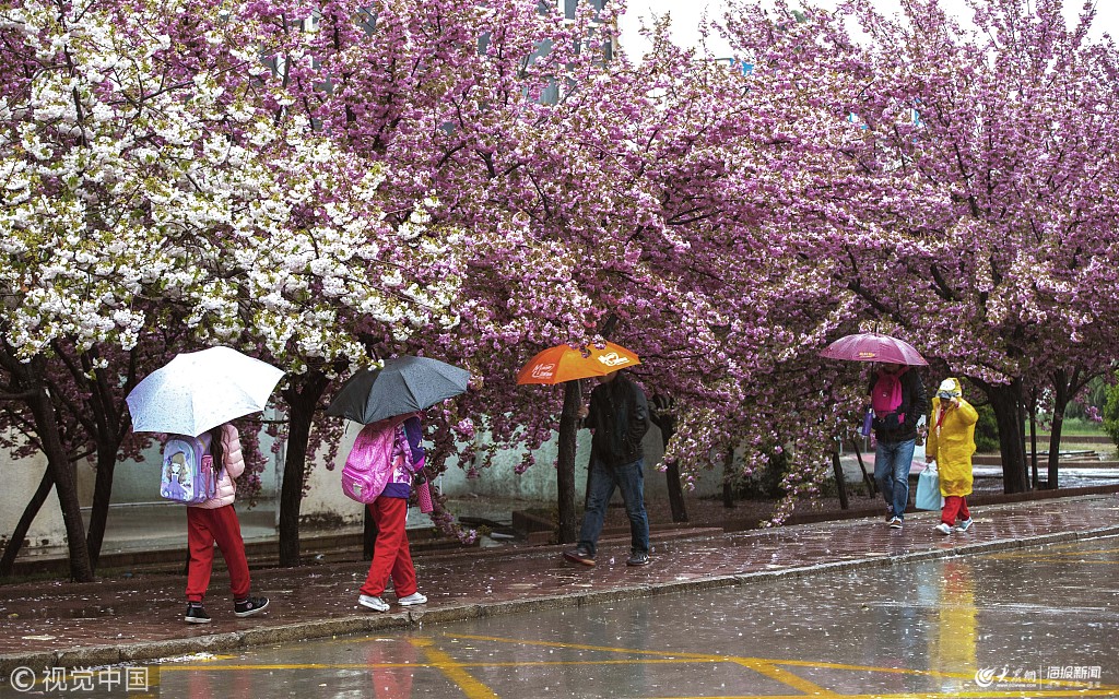 2019年4月9日,濟南喜降春雨,東部濟鋼新村內雨中盛開的櫻花晶瑩剔透、嬌艷欲滴,市民在櫻花林下穿行粉紅色花海,盡享浪漫春色美景。
