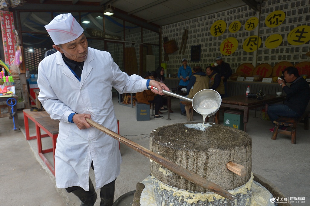 2019年4月28日,山東日照,在大暖帳詩茶小鎮(zhèn),張華江正在用傳統(tǒng)石磨對泉水浸泡過的豆子進行研磨。