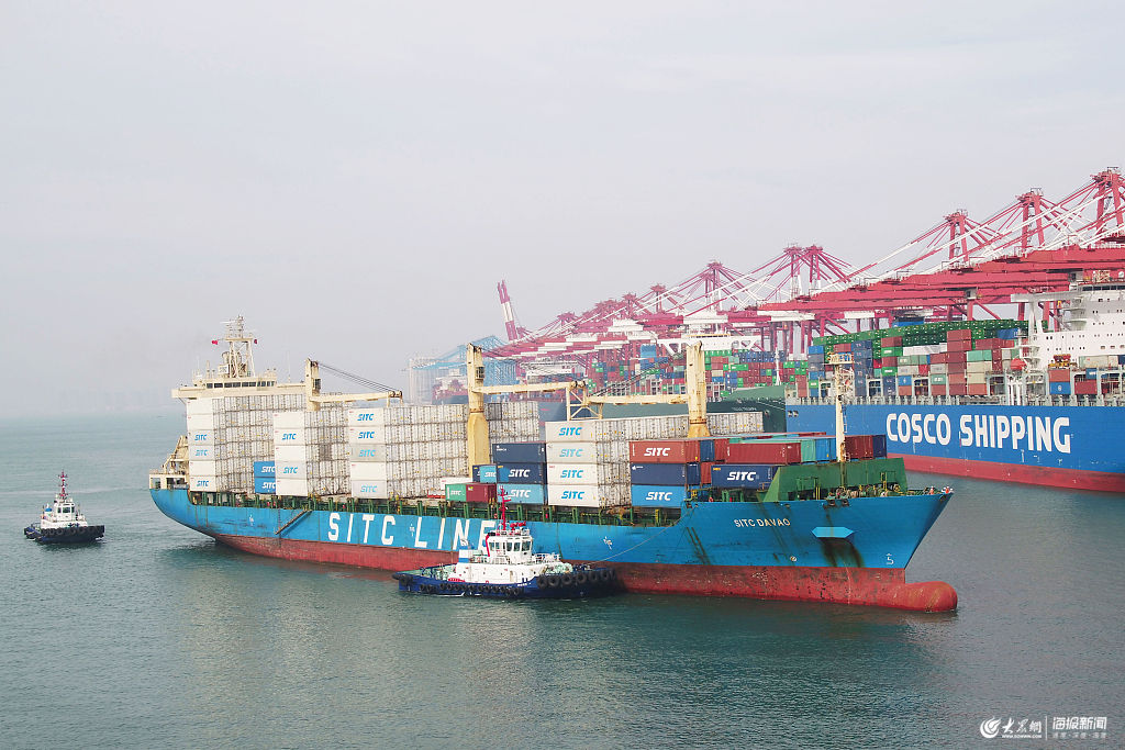 2019年5月8日,山東青島港外貿集裝箱碼頭,貨輪在停靠泊位。