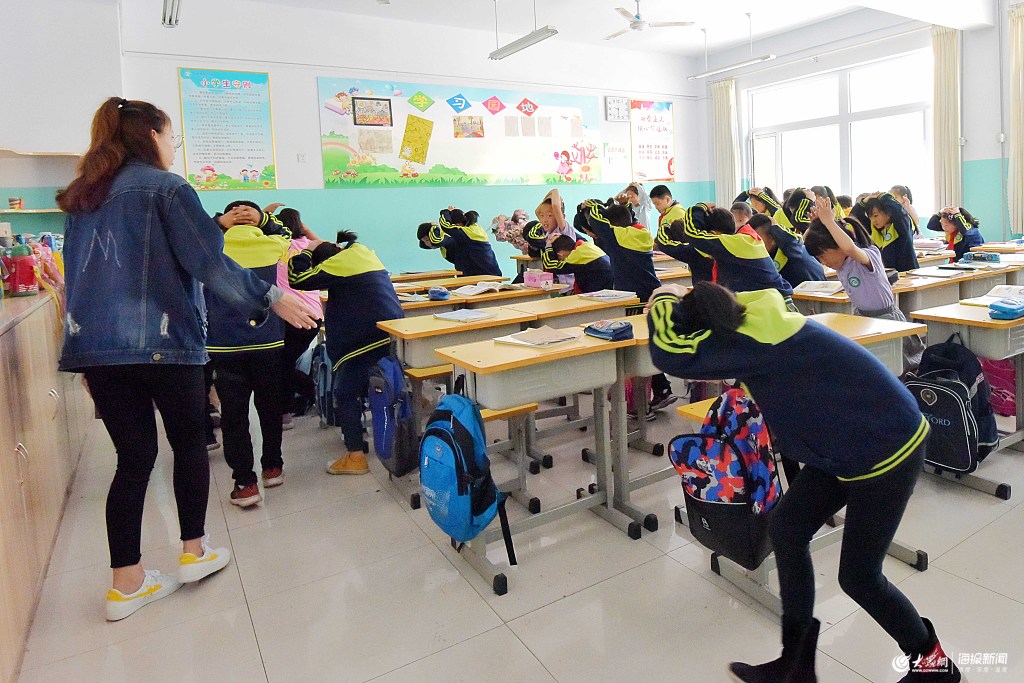 2019年5月9日,山東省濰坊青州市云門山街道青龍回小的學生在防震演練中緊急疏散。