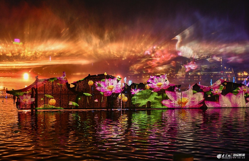 2019年5月10日晚,山東省濟(jì)南市大明湖景區(qū)“泉城夜宴·明湖秀”的演出現(xiàn)場。“泉城夜宴·明湖秀”是以泉城濃厚的歷史文化和秀麗的自然風(fēng)光為創(chuàng)作源泉,深入挖掘濟(jì)南的泉水特色及人文元素,精心打造的一臺大型商演水上動態(tài)實景表演。它匯集噴泉、噴火、噴霧、矩陣光毯、表演大船、升降亭臺、投影機光等綜合演繹的“視聽體驗、綜合水秀”,為游客帶來一場美輪美奐、精彩紛呈的視覺盛宴。