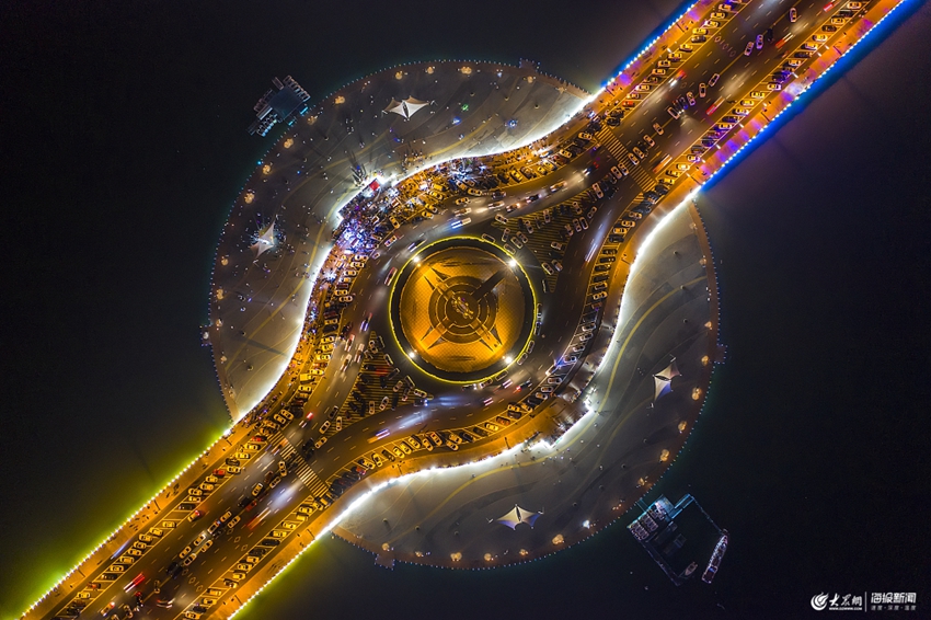 2019年5月3日,山東濱州,“五一節(jié)”假期,眾多市民選擇夜游中海公園景區(qū),私家車在中海橋梁和道路兩邊整齊停放,空中鳥瞰,彷如表帶鑲鉆,格外美麗。