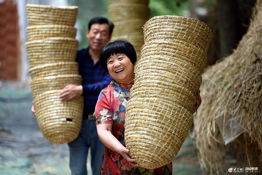 2019年5月28日,麥收時節,山東省臨沂市郯城縣農民把收獲的小麥、玉米皮等秸稈晾曬消毒后編制成精美的秸稈工藝品銷往國內外市場,既避免了秸稈焚燒造成的環境污染,又增加了收入。當地政府因勢利導,協調農商行資金扶持創辦了草編合作社,通過網商、微博等渠道發布供求信息。目前,全縣有10多個專業村上萬名農民從事農作物秸稈編制業。