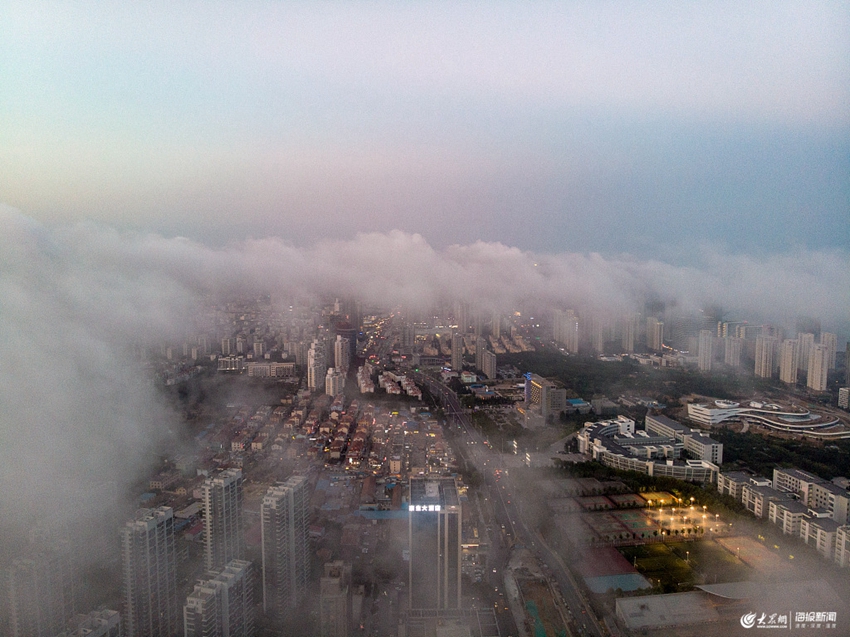 2019年6月11日,山東青島,傍晚時(shí)分的西海岸新區(qū)附近海面掀起平流霧,遠(yuǎn)處的小珠山被云海環(huán)繞,景色迷人。該季節(jié)為當(dāng)?shù)仄搅黛F多發(fā)季節(jié),但是此次黃昏時(shí)分形成的平流霧奇觀較為突然,卻正好被無人機(jī)航拍捕捉。