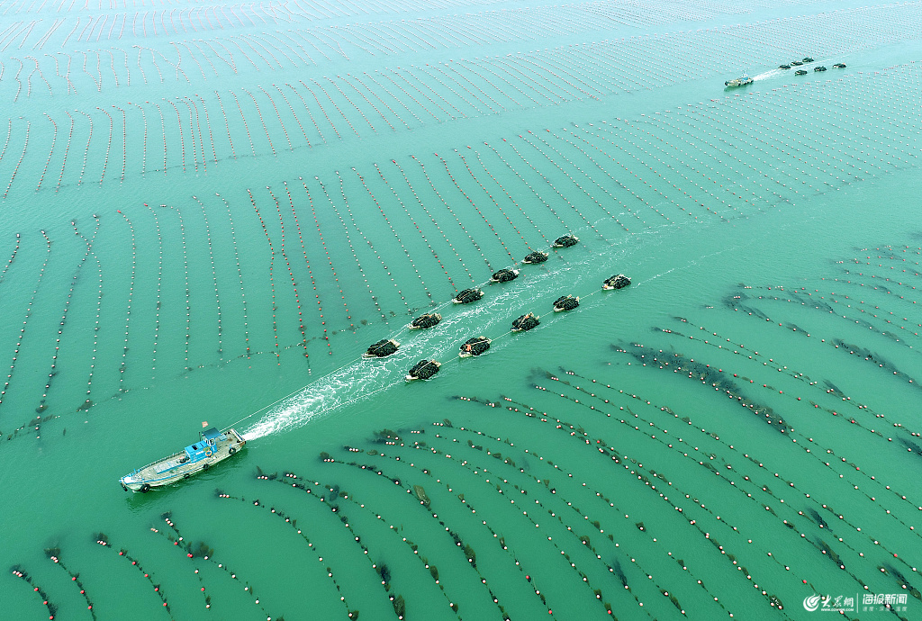 2019年6月16日,山東威海,榮成市桑溝灣海域,舢板滿載海帶駛向碼頭,一家沿海養殖碼頭,一派繁忙運輸海帶的景象。