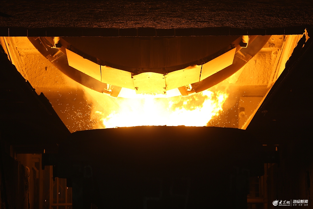 2019年7月4日,青島,侵權的機動車零配件被熔化成鋼水。